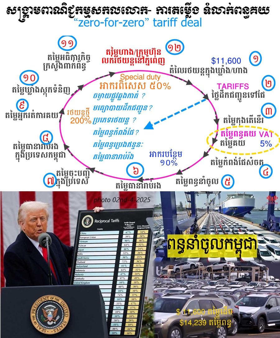 នេះជាការវិភាគ ដ៍ខុសឆ្គង ក្នុង បរិបទសង្រ្គាមពន្ធគយ នៅកម្ពុជា --ឡាននាំចូលពីអាមេរិក មកកម្ពុជា ត្រូវបង់ពន្ធពី ១២០% ទៅ ២០០%។ ជញ្ជក់ឈាមរាស្រ្តមែន! គម្រោងចរចាជាមួយអាមេរិក កម្ពុជាគ្រោងបញ្ចុះពន្ធឡាននាំចូល មកពីអាមេរិក ពី ៣៥% មក ៥% សម្រាប់តែឡានដឹកទំនិញតែប៉ុណ្ណោះ។ រដ្ឋាភិបាលកម្ពុជា គ្រោងបញ្ចុះពន្ធគយនាំចូល មកត្រឹម ៥% (Import duty) សម្រាប់ឡានដឹកទំនិញ + ពន្ធអាករពិសេស (Special duty) ៥០% + អាករលើតម្លៃបន្ថែម (VAT) ១០% = ៦៥%។ រីឯឡានតូច ឬ ឡានលក្ខណៈគ្រួសារ ដូចជា Camry, Highlander, Nissan, Lexus, Rav4 ជាដើម នឹងមិនបញ្ចុះពន្ធនាំចូលនោះទេ គឺយកពន្ធពី ១២០% ទៅ ២០០% ដដែល។